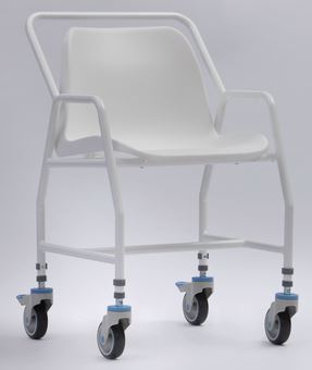 Adjustable height, wheeled shower chair with backrest and armrests for increased support.