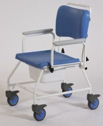 • Bariatric shower commode chair is stylish with matching blue upholstery and four lockable castors for additional safety