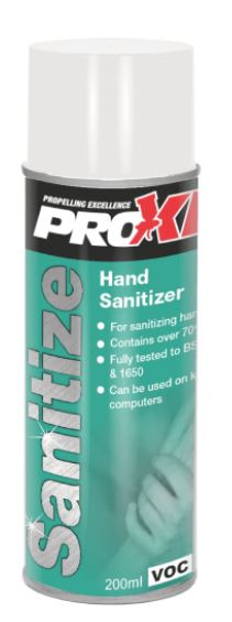 ProXL Hand Sanitizer Aerosol spray conforms to BS EN 1276, 1650 and 14476 with an alcohol content above 70%.