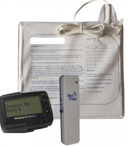 Kit includes 1 x chair sensor, 1 x alarm transmitter, 1 x digital message pager, all batteries.